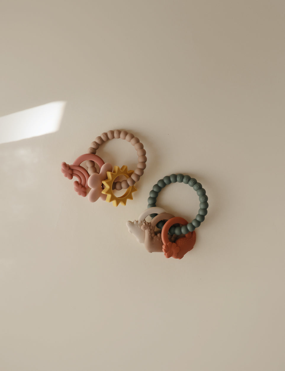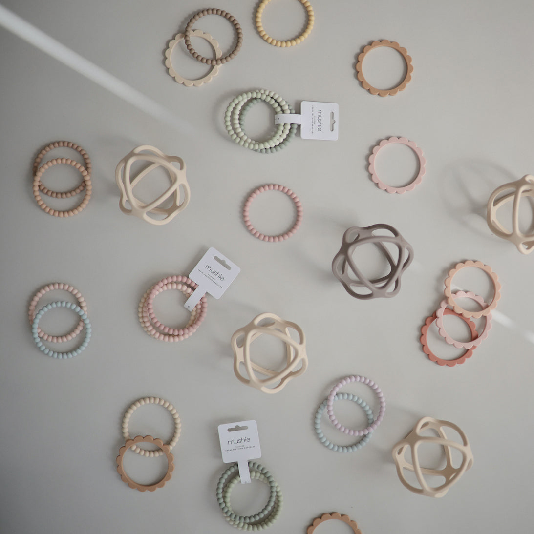 Ontdek onze prachtige collectie Mushie bijtringen, speciaal ontworpen om verlichting te bieden bij doorkomende tandjes. Gemaakt van 100% veilige siliconen of natuurlijke materialen, zijn deze bijtringen niet alleen praktisch, maar ook stijlvol vormgegeven in zachte, moderne kleuren.