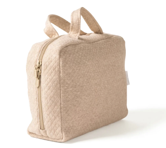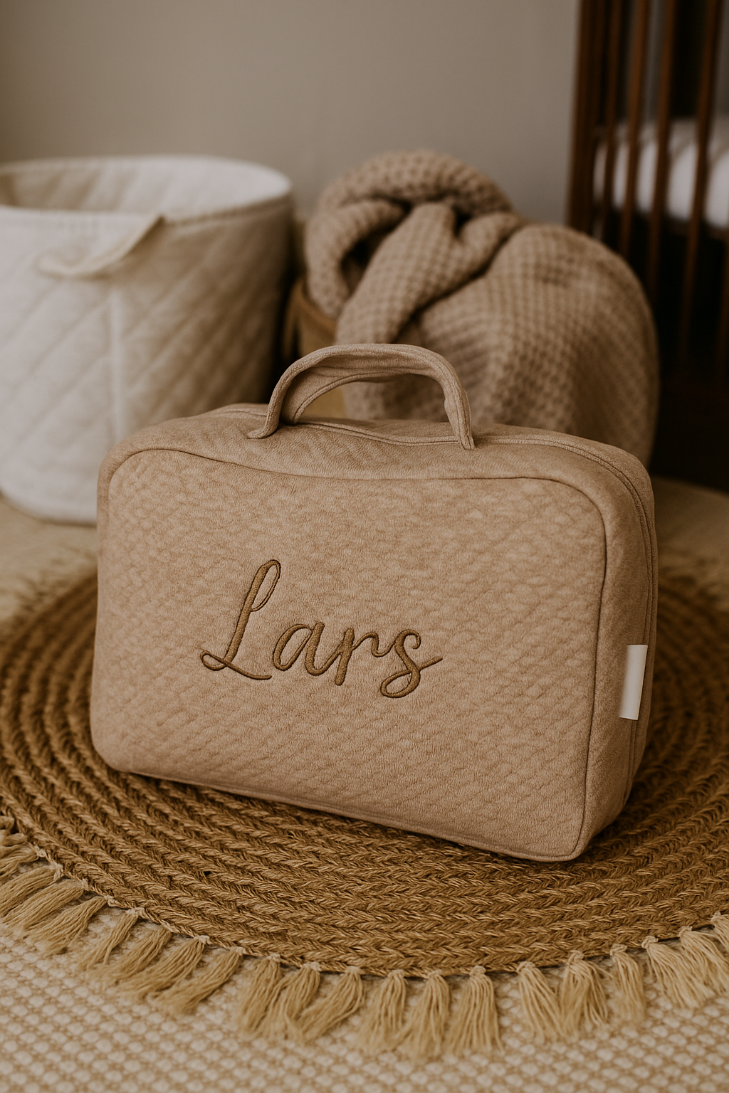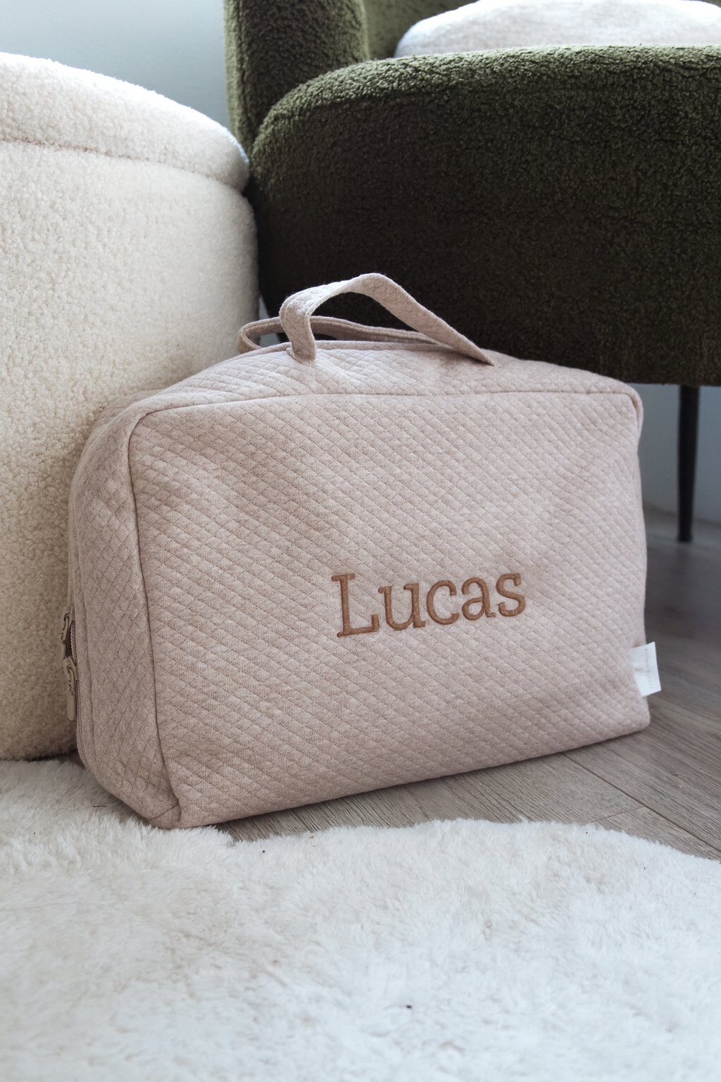 Deze logeertas is de perfecte metgezel voor een nachtje bij oma en opa, een weekendje weg of een daguitstap. Gemaakt uit zachte, doorstikte stof in elegant losange patroon en verkrijgbaar in tijdloos wit of warm camel. De tas is ruim genoeg voor kleertjes, verzorgingsspulletjes en een favoriete knuffel, zonder log of zwaar aan te voelen.