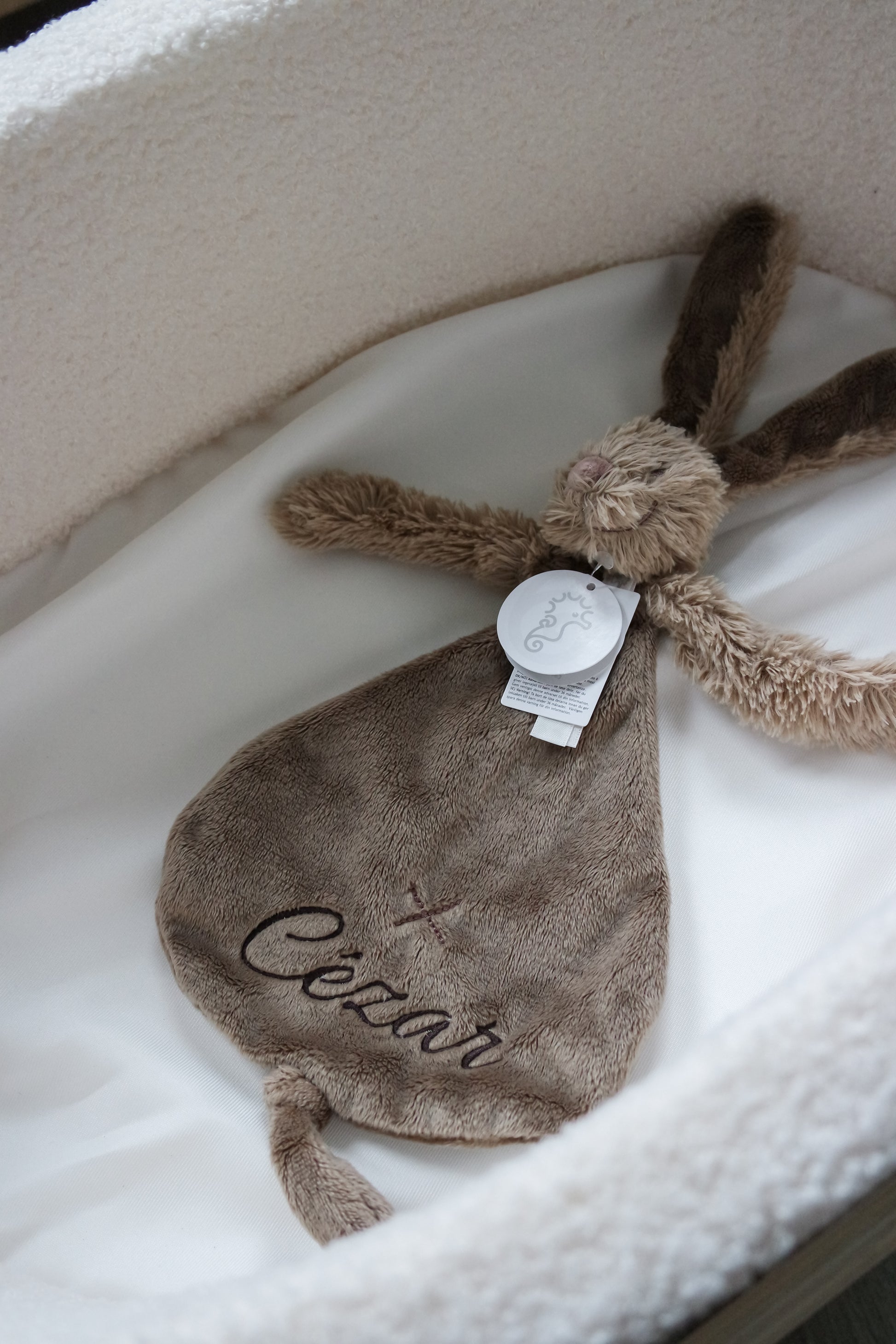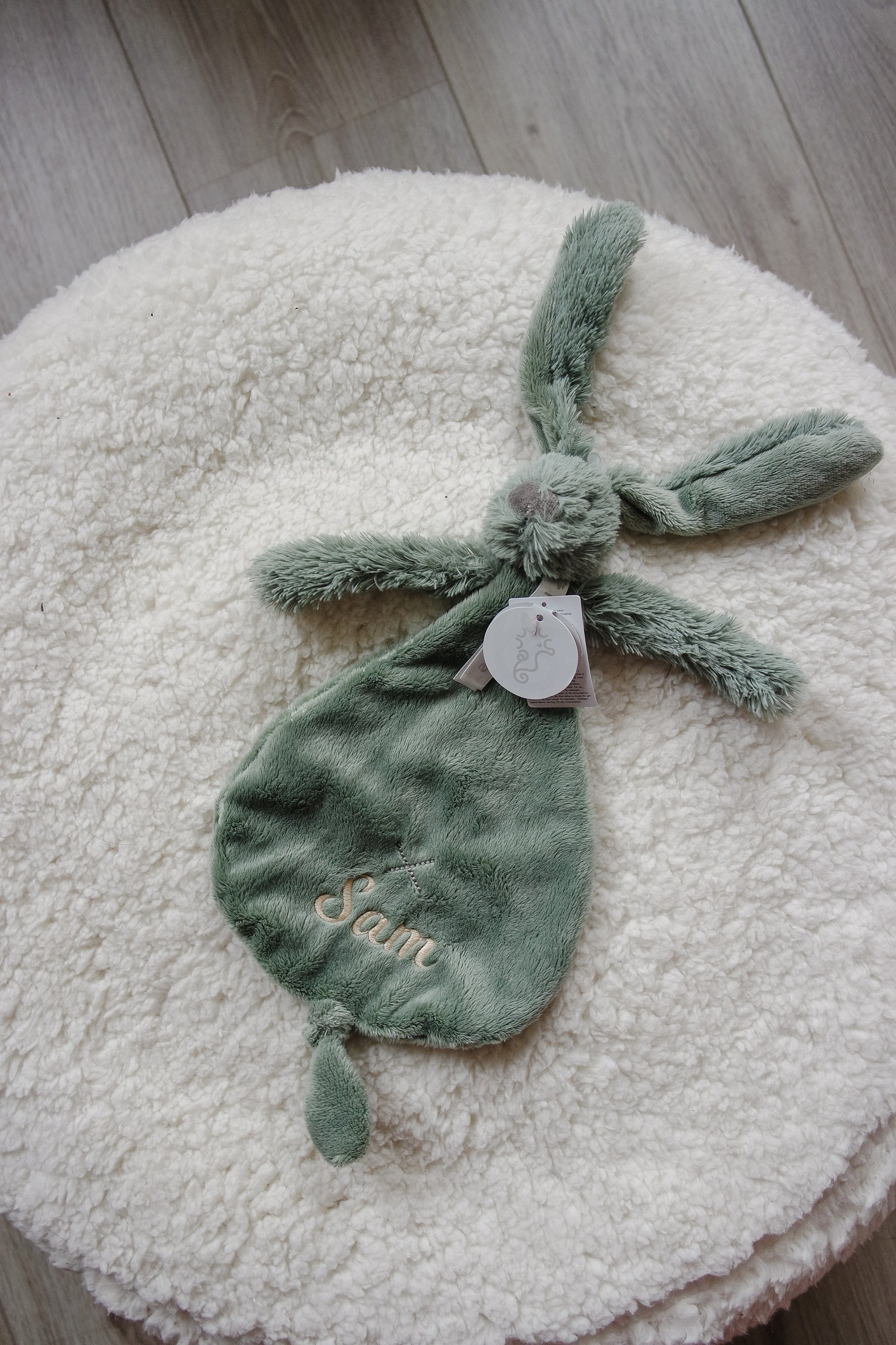 Laat de naam van het kindje subtiel borduren op het doekje voor een persoonlijk accent. Dankzij het knoopje aan het staartje kan er eenvoudig een speentje aan bevestigd worden.
