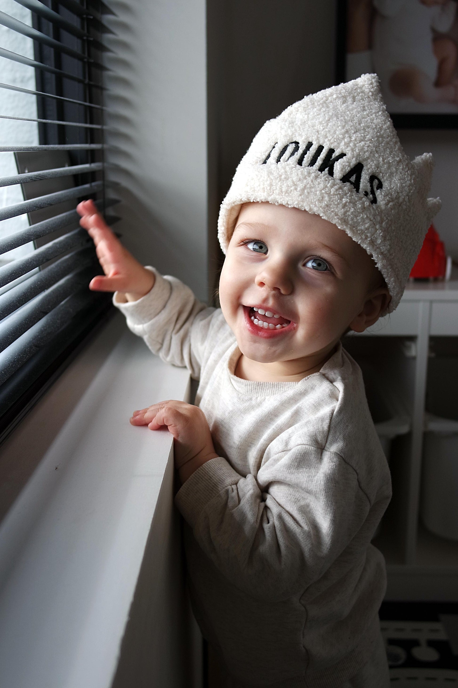 Maak elke verjaardag extra bijzonder met deze verjaardagskroon met naam. Gemaakt van een stevige maar zachte bouclé stof en gevoerd met ademende tetra stof, voelt de kroon comfortabel aan en blijft hij mooi in vorm.